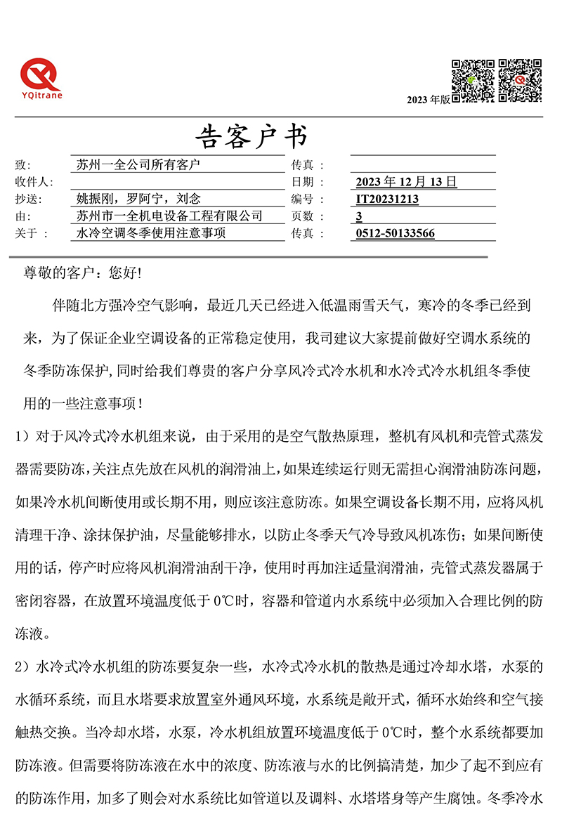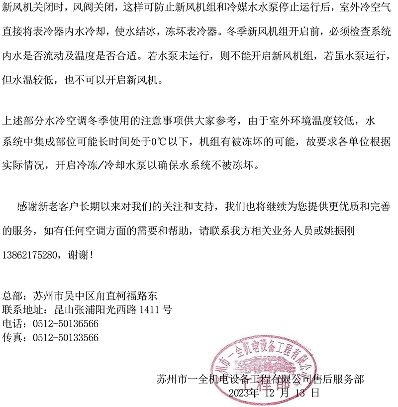 IT20231213冬季空調(diào)防凍保護(hù)告客戶書(shū)2023年
